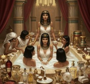 Picture it: a moonlit chamber in Alexandria, the air thick with the scent of jasmine and myrrh. Servants move like ghosts, their footsteps silent on marble floors, as they prepare the queen’s ritual. A golden basin gleams under torchlight, filled with warm water that shimmers like liquid starlight. Into it, they pour treasures of the earth—milk, honey and oils, each chosen with care, each carrying the wisdom of centuries. This was no ordinary bath. It was alchemy, a potion for youth and beauty, crafted to make Cleopatra not just a queen, but a goddess.